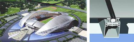 ●結(jié)構(gòu)特點——屋面采用鋁單板面材,連接體系采用框架式隱框幕墻連接系統(tǒng)。